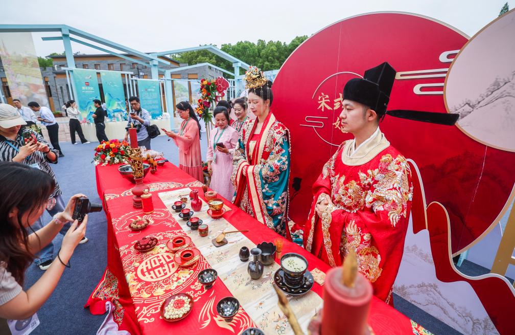 5月19日,在2025年“中国旅游日”全国主会场宁波宁海,当地“宋式婚俗”旅游产品展示吸引游客拍照打卡。新华社记者 徐昱 摄