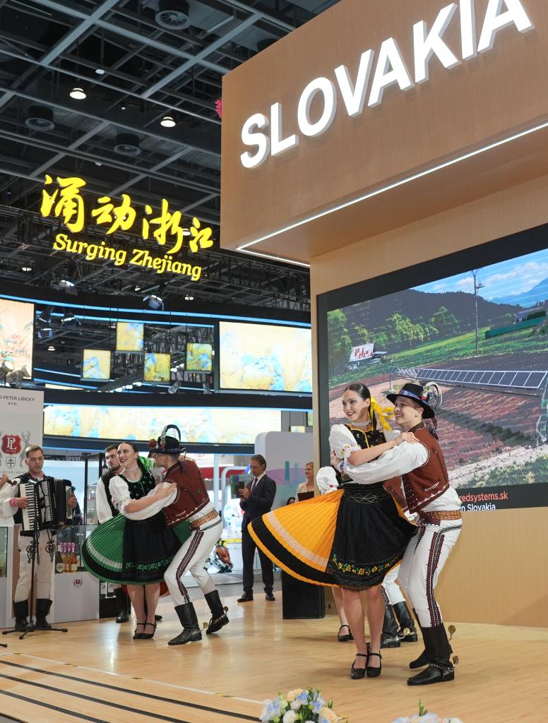 5月22日,来自斯洛伐克的表演者在中东欧展馆进行传统舞蹈表演。新华社记者 黄宗治 摄