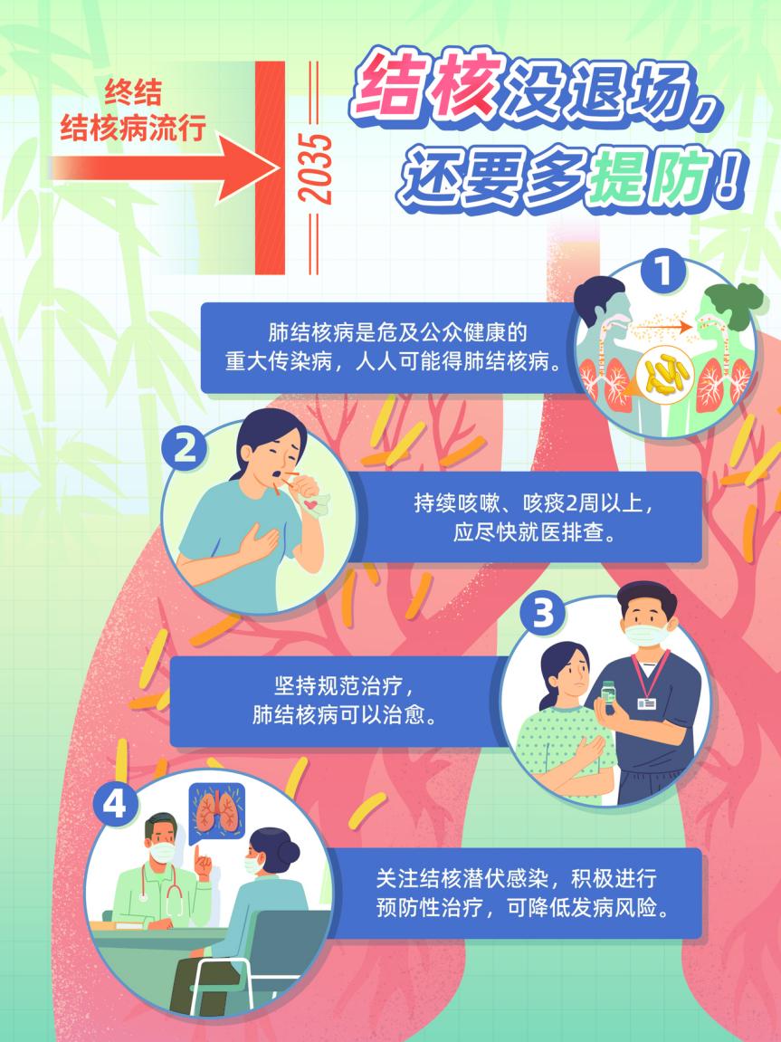 浙江省预防医学会流行病学专业委员会委员、宁波市第二医院副主任医师陈琴介绍,结核病是由结核分枝杆菌引起的慢性感染性疾病,可分为肺结核病和肺外结核病,其中肺结核病占90%以上,也是我国法定乙类报告传染病。人群普遍易感,特别是免疫力低的人群,如老年人、儿童、糖尿病患者、艾滋病病毒感染者、尘肺患者、长期使用糖皮质激素或免疫抑制剂的人群。肺结核病的常见症状包括咳嗽、咳痰、痰中带血、咯血、胸痛等;患者通常午后有低热,以及睡眠时会出汗,睡醒后出汗停止的情况。另外还有饮食差、疲乏、消瘦等全身症状。