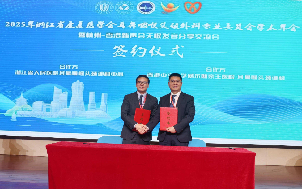 据介绍,葛明华带领的头颈外科团队从2014年起就与香港新声会合作开展了无喉发声系列公益活动,并取得了积极反响。为进一步深化浙港两地医学交流,活动当天,浙江省人民医院还与香港中文大学威尔斯亲王医院签署友好科室备忘录。备忘录明确双方将在未来五年内探索多层次合作,包括在耳鼻咽喉头颈外科领域联合培养青年人才,协同开展临床研究和应用基础研究;合作举办大学学术会议,以及合力拓展公益活动等,双方还将探索远程会诊和便捷的患者转诊服务。双方对未来的合作充满期待和信心。