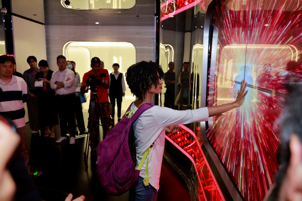 拉美社记者LEYVA ROMEROEVELYN CARIDAD在大丰科创中心科技体验中心展厅互动。