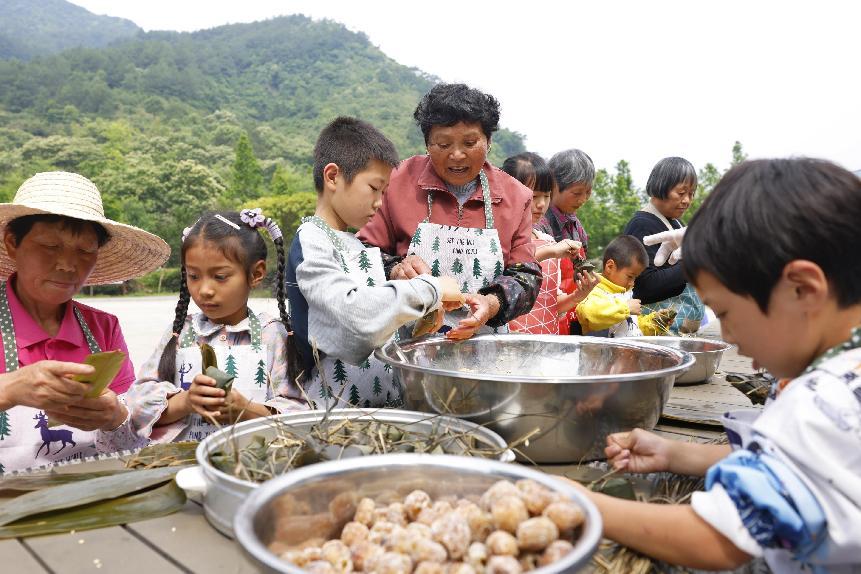 “粽包分两髻,艾束著危冠。”端午期间,在杭州市淳安县左口乡显后村,丰富精彩的端午活动吸引了许多亲子家庭参与。包“金丝琥珀蜜枣”传统粽子、制香囊、划龙舟、挂艾草……一系列活动让孩子们充分感受到传统文化的魅力。