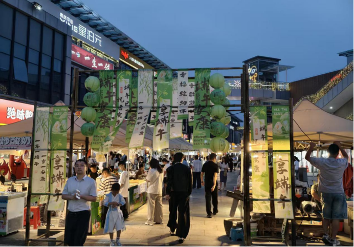 活动现场内容丰富:绍兴环城河上鼓声铿锵,龙舟竞渡激荡奋进豪情;精彩的水上火壶表演于粼粼波光中展现非遗技艺魅力;社区包粽子大赛串起浓浓邻里温情;运河沿岸同步开设水岸共富集市,汇聚80余家绍兴老字号、非遗手作及文创产品摊位。社区集市聚焦“味觉经济”,设置美食站点,创新采用“商业+志愿服务”模式,鼓励居民展销手作美食,联动爱心企业参与公益项目,推动商业活力与邻里温情的有机融合。