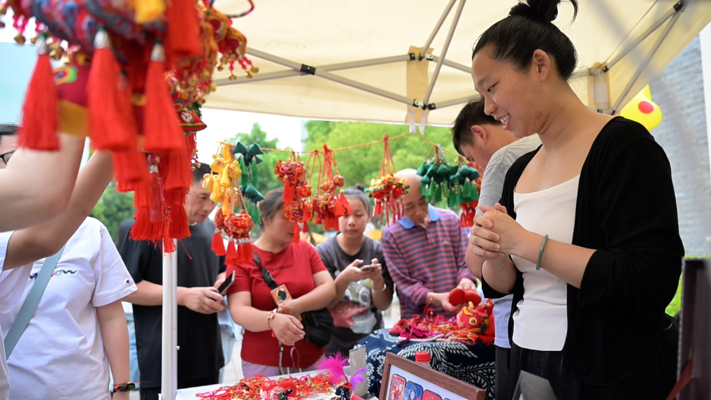历本袋(香包)制作技艺代表性传承人夏晓梅耐心地向游客介绍她的作品。“现在香包的使用场景、佩戴方式都与以往不同,所以我们的花样款式一直在创新改变,可以做汽车的车挂,可以做家具摆件装饰。”夏晓梅说。