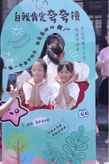 成长礼现场,心理游园活动充满趣味与意义。孩子们站在“夸夸镜”前自信宣言“我是独特的星光”,用彩色掌印装点“爱自己”主题背景墙。在欢声笑语中,他们不仅收获了特别的纪念品,更在互动体验中学会接纳自我、欣赏他人。