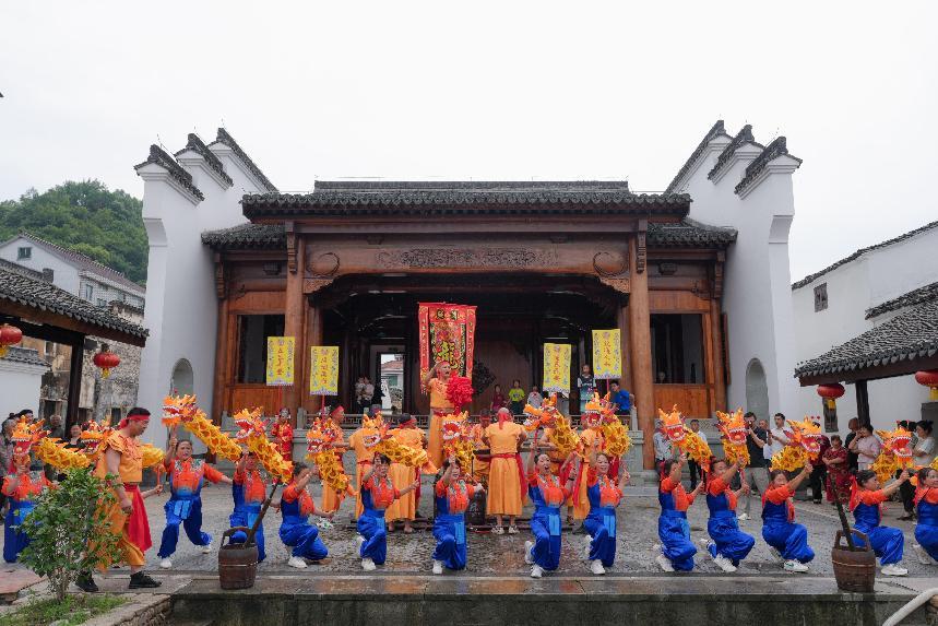 “开洋龙!”随着旗牌开道,锣鼓震天,古董水龙昂首巡街,启动“射洋龙民俗大巡游”,水柱冲天,水幕笼罩青石板路,村民、游客欢笑着迎水纳福。“太有意思了。”来自上海的游客尹秋说,“第一次来桐庐,刚好遇上文化和自然遗产日活动,不仅看到了百年水龙的民俗表演,还了解到了桐庐剪纸、中药文化等许多非遗项目,收获满满。”