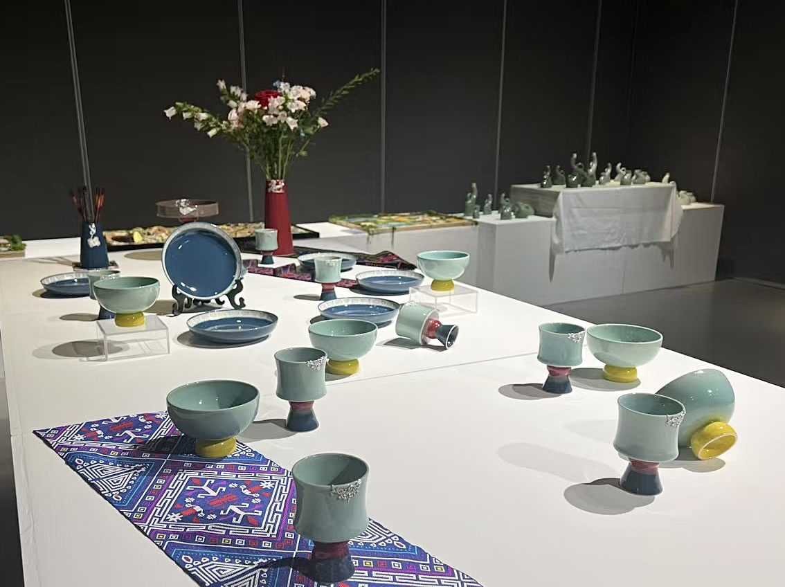 毕业生雷舒雯的一套陶瓷餐具《织梦畲乡》将畲族元素融入创作,呈现出青、红、蓝等色系相互碰撞的色彩美学,借此传递“民族一家亲”的美好愿景。留龙创业的她坦言,最初并未计划长期留在龙泉,但随着对青瓷深厚文化底蕴的深入了解,与其他三位同学一起决定成立了无边陶瓷工作室,专注于陶瓷餐具、杯子等日用器创作。