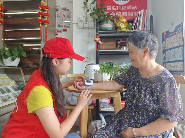志愿者在红色驿站内为老人测量血压。