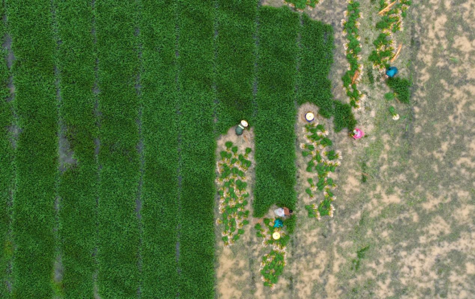 随着他们的身影在水田中穿梭,原本空旷的稻田渐渐被绿意填满,一株株秧苗由点成线,与蜿蜒曲折的田埂相互映衬,宛如水墨大师挥毫泼墨,勾勒出层次分明的诗意画卷。