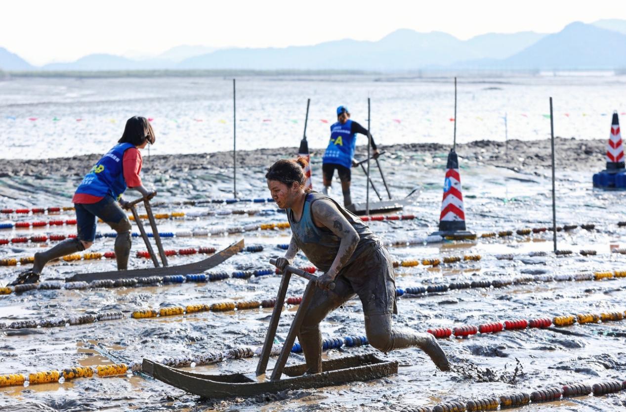 日头正盛,新桥镇韩升村的滩涂上,专业团队正忙着维护场地、测试器材,为大赛做准备。记者也亲身体验了一把:跨上“泥马”,单腿发力一蹬,便在湿滑的滩涂上飞驰起来……