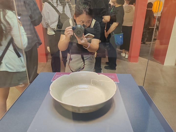 图为当天展出的“五瓣葵口大内凹底秘色瓷盘”。新华社记者 冯源 摄