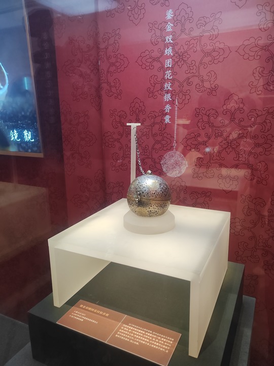 图为当天展出的法门寺博物馆藏“鎏金双蛾团花纹银香囊”。新华社记者 冯源 摄