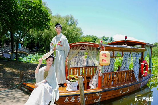 除了市集,全天候的互动活动也为游客带来了从艺术到音乐的感官盛宴。“荷风艺术”摄影展汇聚全城投稿佳作,巨幅荷花大片带来“人在画中游”的沉浸式看展体验。据悉,照片征集活动将持续到8月底,投稿入选的游客有机会获得惊喜好礼。“荷风仲夏”音乐会同样精彩,白天在市集区荷塘边有浪漫弹唱,夜晚则在水上黄金游线·游船上举办移动演唱会。此外,荷花仙子、复古卖货郎等“宋潮”NPC穿梭荷塘,与游客互动并赠送荷花鲜切礼,让游客能把夏日荷韵“打包”带回家。遍布景区的“巨出片”打卡点,结合发“圈”线上互动,正在引爆绍兴晒“荷”潮。