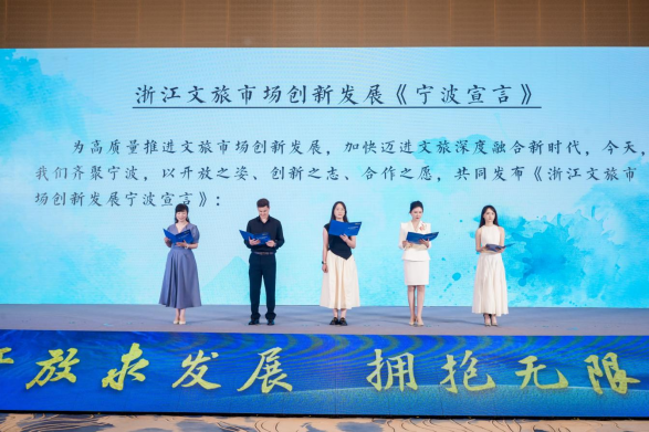浙江作为中国文化和旅游高质量发展的先行地,肩负着创新引领、示范带动的使命,为进一步凝聚共识、擘画未来,现场,文旅部门代表、国际推介官、金牌导游、饭店业代表、艺人代表分别从战略发展、开放融合、数智创造、品质追求、共情传播等五方面内容,发布浙江文旅市场创新发展《宁波宣言》。未来将以宁波为起点,以宣言为约定,为新时代文旅经济的迭代升级提供“浙江方案”。