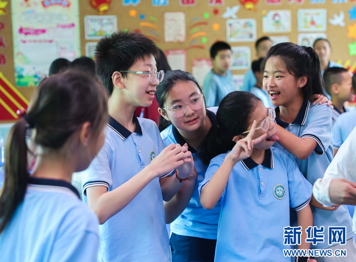 7月1日,东和乡中心学校的孩子们在进行互动游戏。