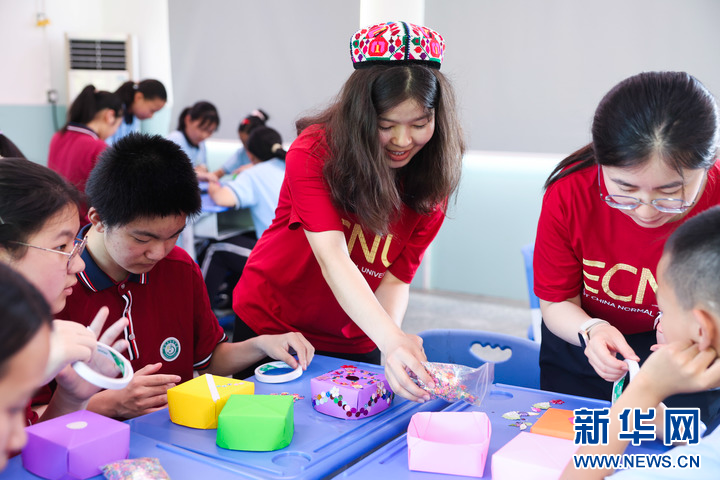 7月1日,华东师范大学的大学生志愿者教孩子们制作花帽。