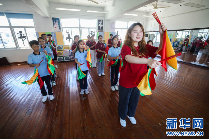 7月1日,华东师范大学的蒙古族大学生志愿者王馨瑜给孩子们示范筷子舞。