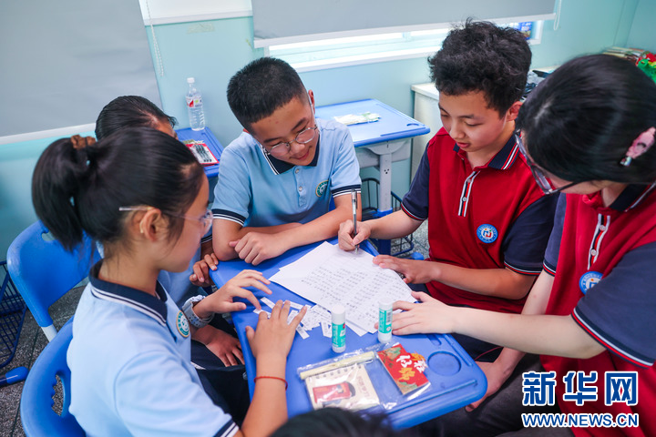 7月1日,东和乡中心学校的孩子们在进行拼贴诗的游戏。