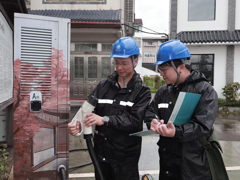 国网温州供电公司工作人员对充电站点进行安全检查,做好隐患消除整改,助力台风期间设备安全运行。翁梓涵 摄