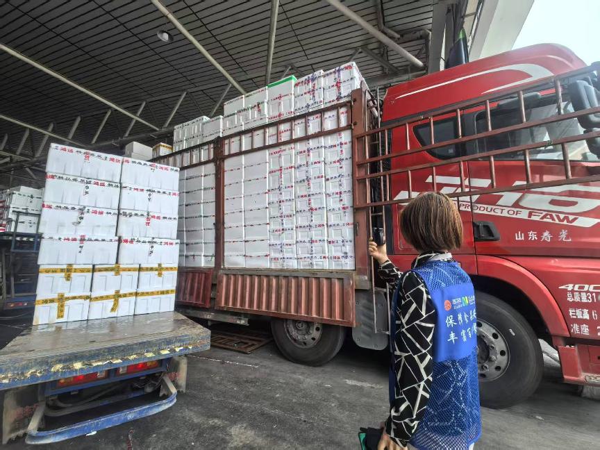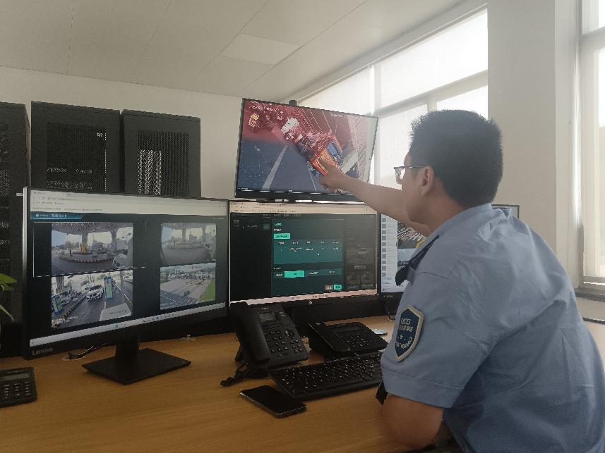 收费站人员借助远程视频实时查验绿通车在市场内卸货时的货物情况。