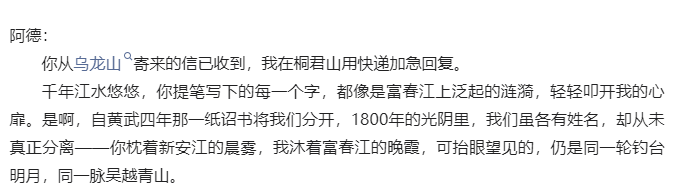 所以,阿德又在信里说:“名字从来不是影响我们感情的因素。好比范仲淹的一句‘潇洒桐庐郡,乌龙山霭中’,说的就是德哥家的景色。你说你是‘潇洒桐庐’,我自然是支持的,毕竟大家同住在一幅山水画卷里,推窗就是《富春山居图》。”