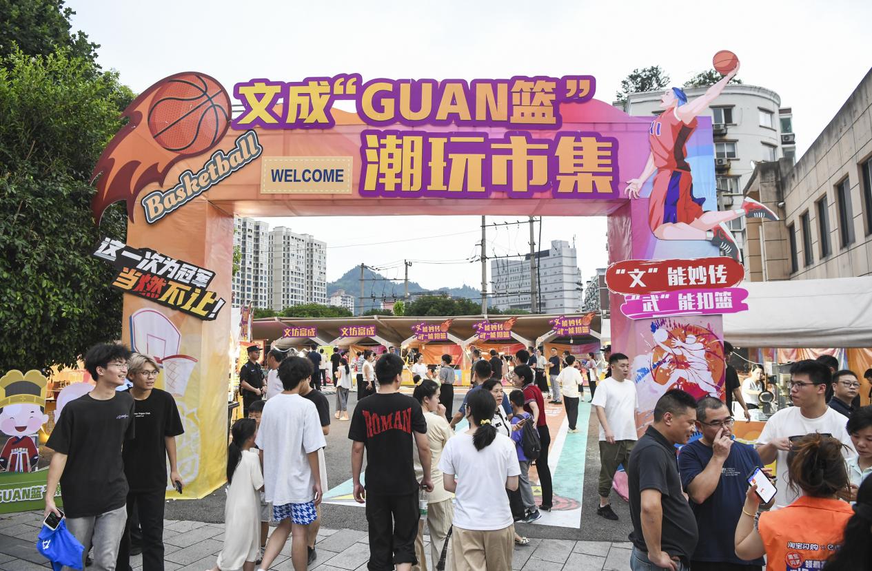 7月17日晚,“浙BA”温州赛区预选赛文成主场比赛在浙江温州文成县体育中心体育馆开赛。场内,文成队跟平阳队展开激烈对决,观众热情似火,欢呼声此起彼伏;场外,“GUAN篮”潮玩市集热闹非凡,非遗文创的古韵与特色美食的香气交织碰撞,展现出“体育+文旅”的独特魅力,让这个夏夜因篮球而沸腾,因文旅而鲜活。