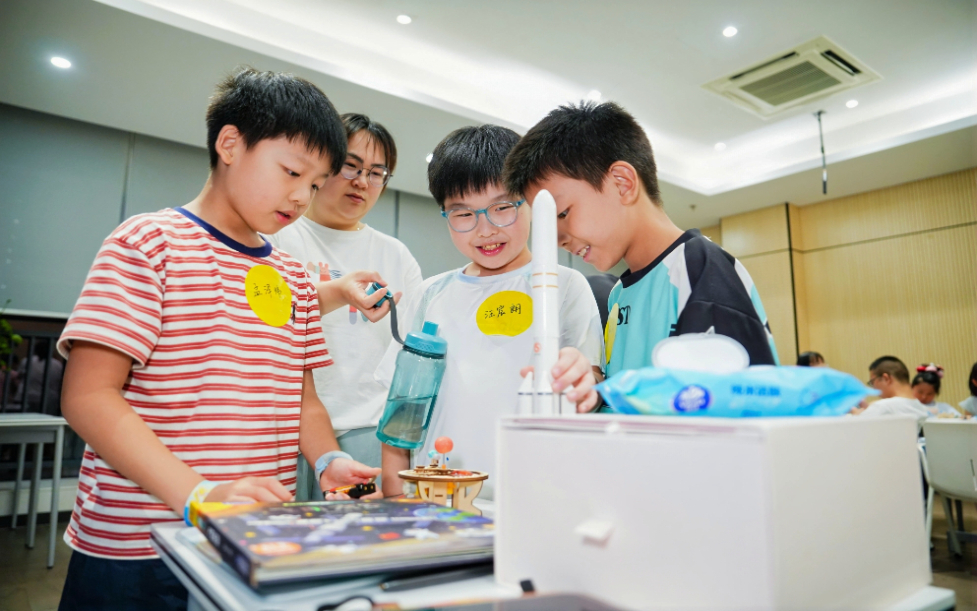 最紧张刺激的当属“银河寻宝计划”。一排排书架化为星际迷宫,孩子们穿梭在书籍线索中,从《火星大营救》到《你好,灯塔》,每一次发现都伴随着惊喜的欢呼。破解北斗星密码、打开宝箱的瞬间,胜利的欢呼声将活动带入高潮,“银河徽章”成为他们勇敢探索的最佳见证。