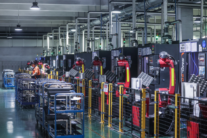 7月16日,长兴县煤山镇浙江华熔科技有限公司车间,自动化生产线在加工石墨双极板。新华社记者 徐昱 摄