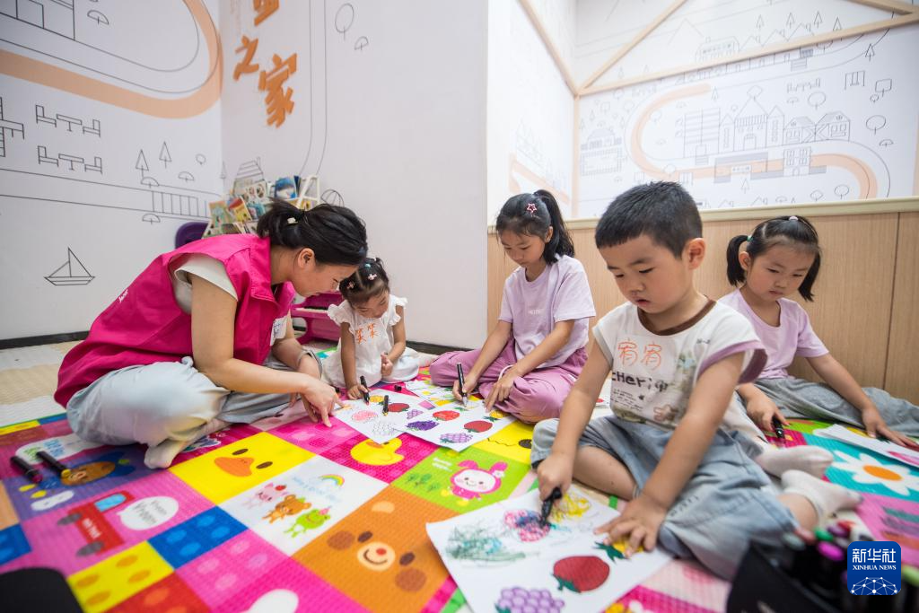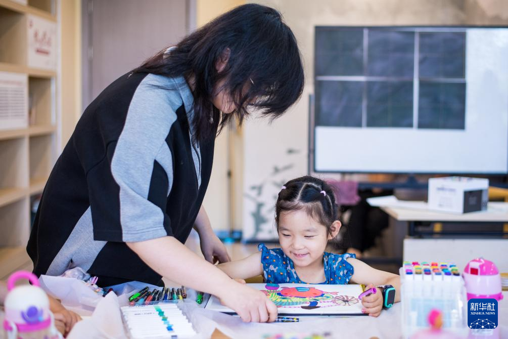 7月21日,在杭州市上城区彭埠街道党群服务中心,小朋友在老师带领下学习绘画。