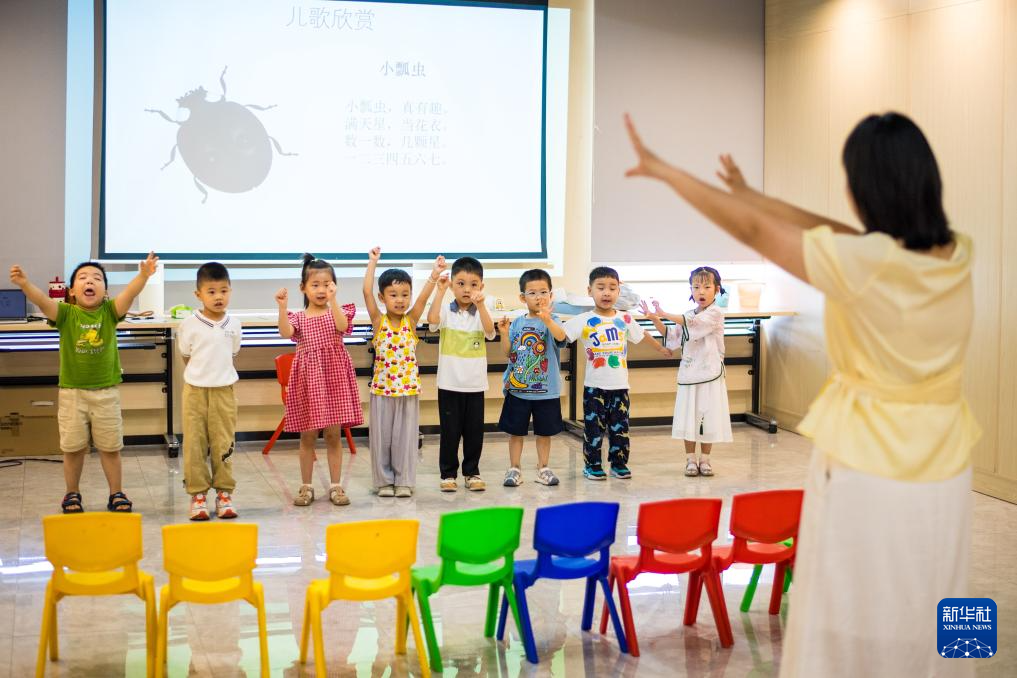 7月21日,在杭州市上城区彭埠街道党群服务中心,小朋友在老师带领下唱儿歌。