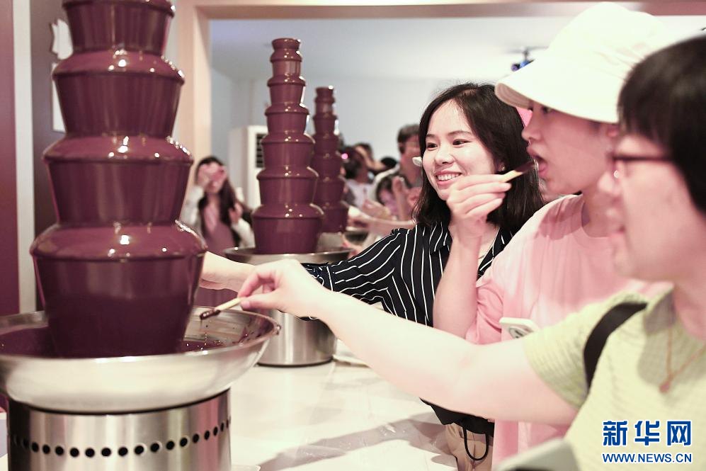 8月7日,游客在歌斐颂巧克力小镇品尝巧克力。