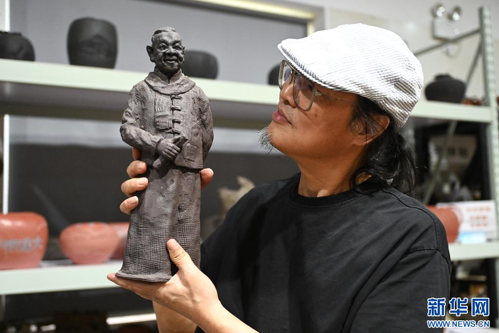 8月7日,在嘉兴市嘉善县缪家村,非遗传承人丁海龙展示泥塑作品。