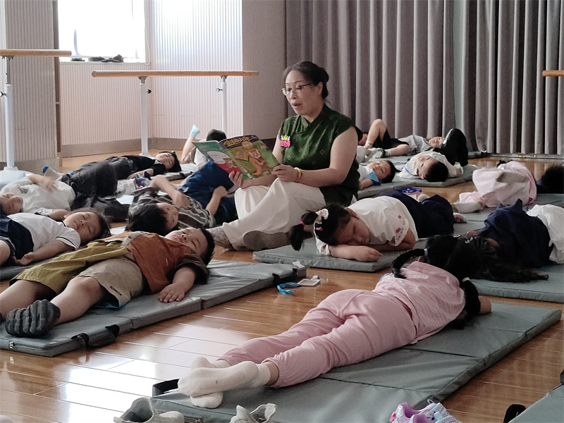 一年级的沈老师坐在垫子拼成的 “小岛” 中央,举起绘本轻轻念。念完绘本,沈老师悄悄给踢开外套的孩子盖好衣角,指尖碰到孩子温热的小手,像触到一颗饱满的露珠。