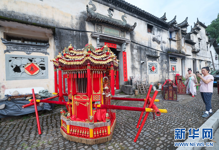 这是在七夕民俗文化旅游系列活动传统婚俗展上拍摄的花轿和婚嫁物品(8月20日摄)。