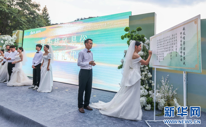 8月20日,在诸暨市东白湖镇斯宅村举行的集体婚礼上,新人在移风易俗倡议上签名。