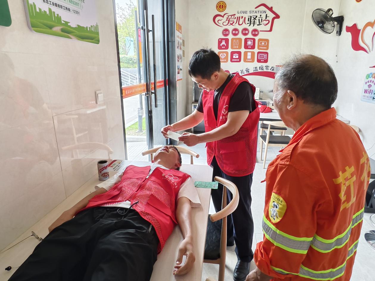 驿站专门设置“夏日健康角”,除了配备急救药箱、血压计、血糖仪之外,还定期开展“避暑微课堂”。“香溢”志愿者现场演示讲解中暑的快速识别与紧急处置方法、基础心肺复苏操作规范,并向参与课堂的群众发放精心编制的《夏季户外工作健康指南》。
