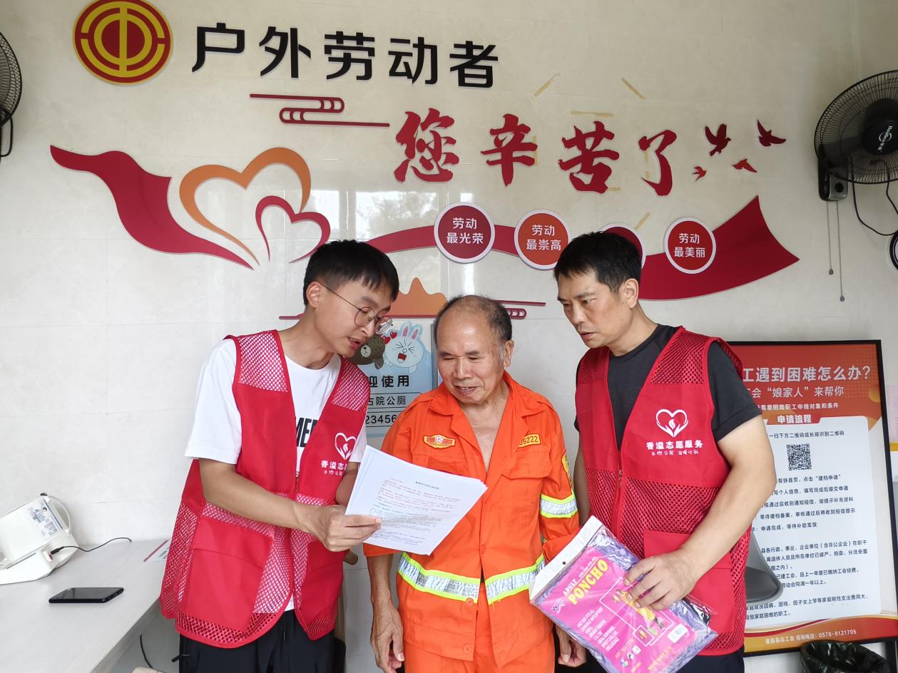 不仅如此,驿站还拓展了流动服务。“香溢”志愿者们以驿站为圆心,深入街头巷尾,为高温下作业的劳动者送上包含防暑药品、降温毛巾的“清凉礼包”。