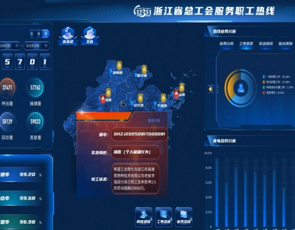 以“智”促质,以“智”提效,浙江省职工服务中心的创新不止于此。依托大数据分析,“12351”构建了红橙黄三色预警体系,对新业态劳动纠纷、群体性劳资纠纷、信访舆情等共性风险进行深度挖掘和提前预警,成功实现从“解决一件事”到“解决一类事”的跃升。
