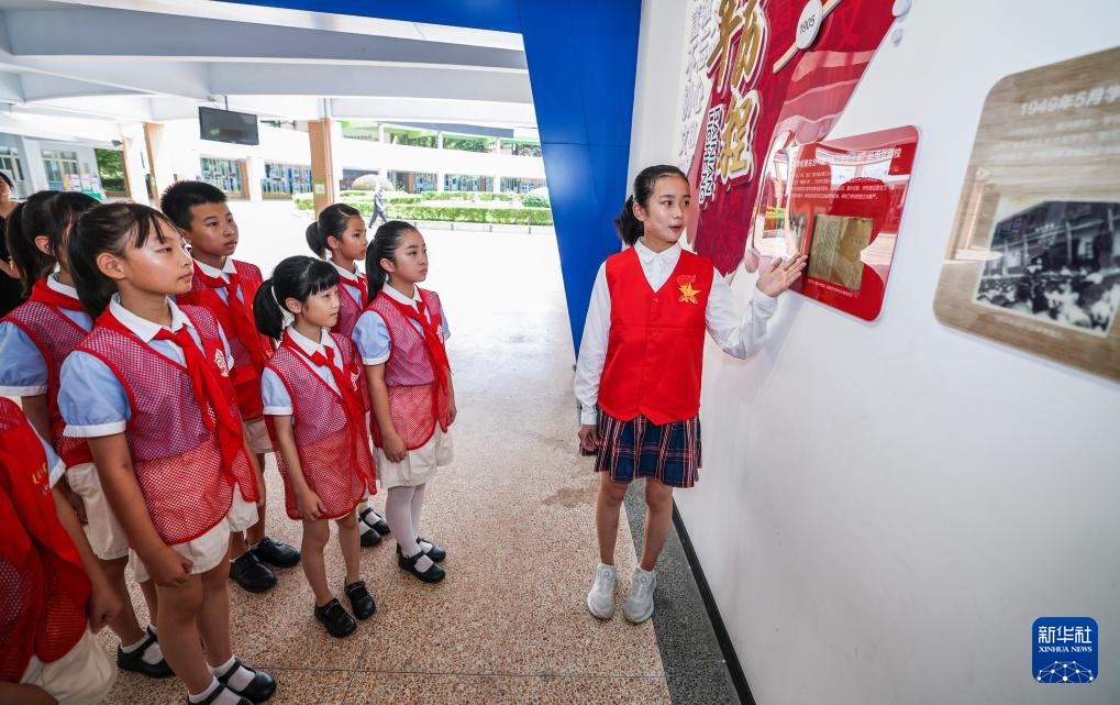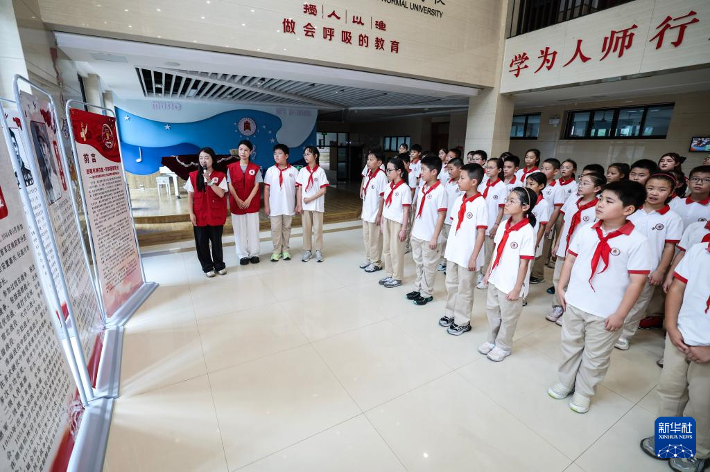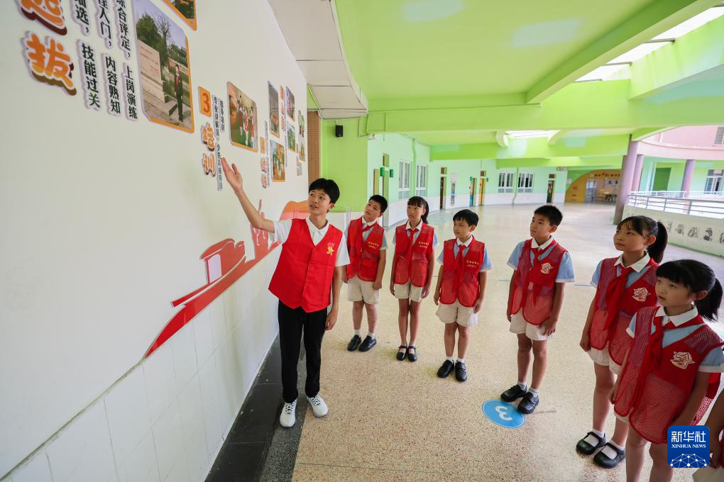 9月4日,在嘉兴市实验小学校史连廊间,全国优秀少先队员王希然(右一)为新一批红船小讲解讲述学校的百年校史,坚定“讲好学校故事、讲好国家故事”的使命担当。