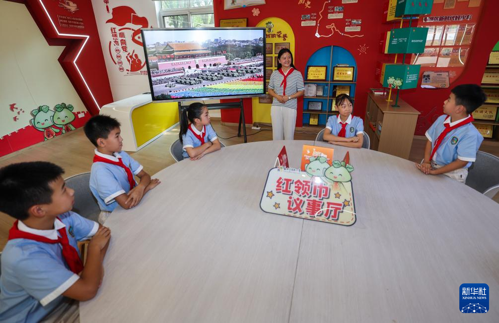 9月4日,嘉兴市实验小学的全国优秀辅导员陈伟凤老师(中)与学生们一起交流观看九三阅兵后的感受。