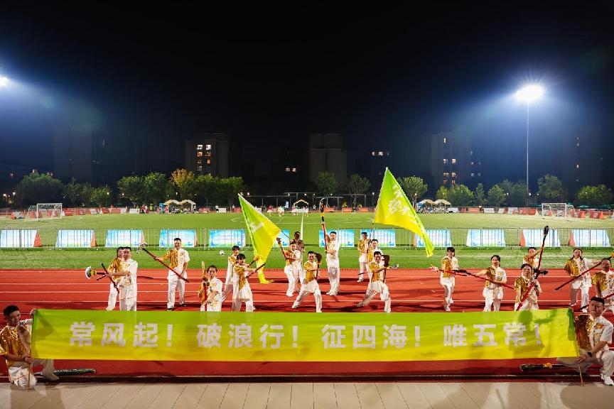 在热烈的氛围中,浙江省乡村文化能人、区级文化特派员、五常十八般武艺非遗传承人洪明宝稳步走向中圈为比赛开球。瞬间,鼓声、呐喊与加油声汇聚成最高燃的开场乐章,正式拉开本场对决的序幕。五常街道十八般武艺书记表演团队也在观赛台上助威,将传统文化与体育精神完美融合。