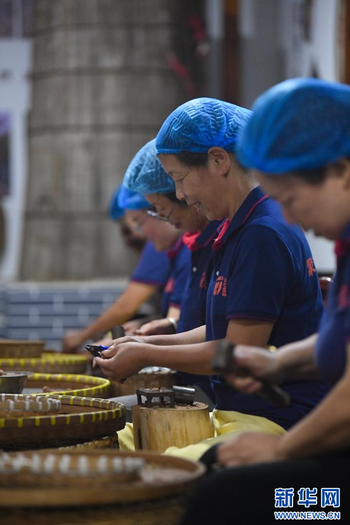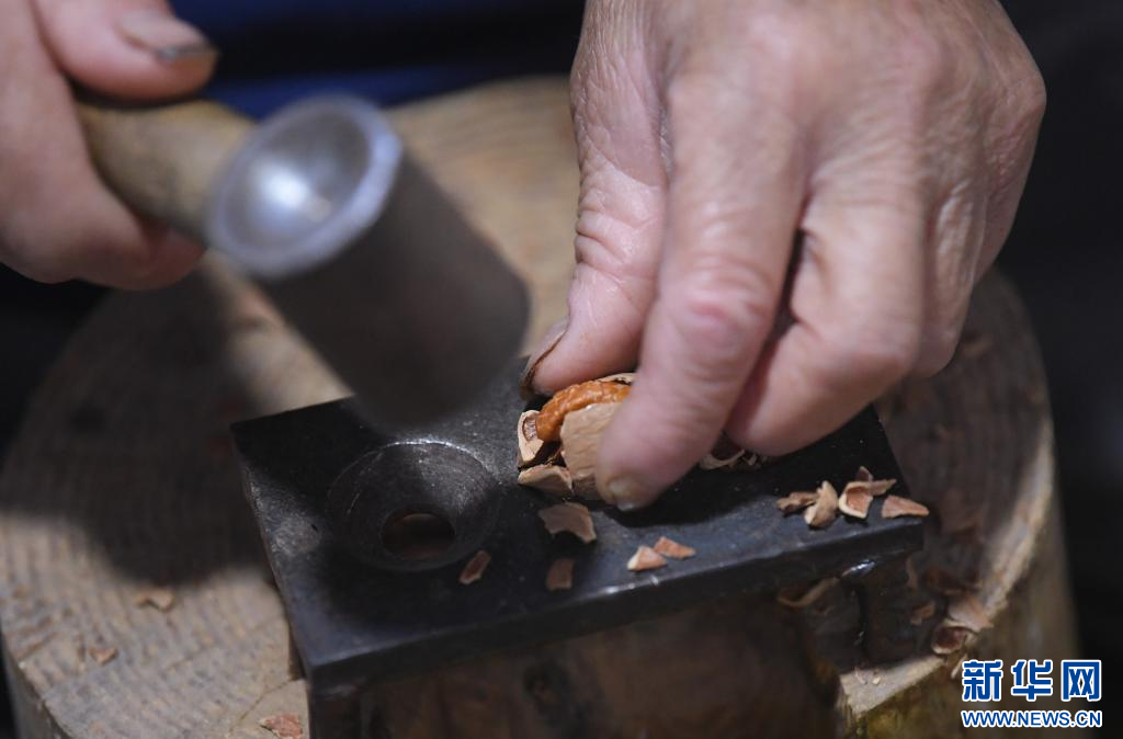 9月9日,在临安龙岗镇一家山核桃生产企业,工作人员通过手敲山核桃取整仁。