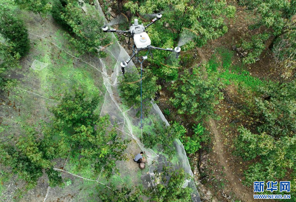 9月9日,在临安岛石镇的一片山核桃林上方,农用无人机将采收的山核桃运送出山(无人机照片)。