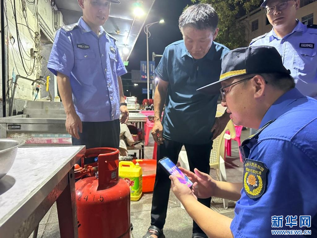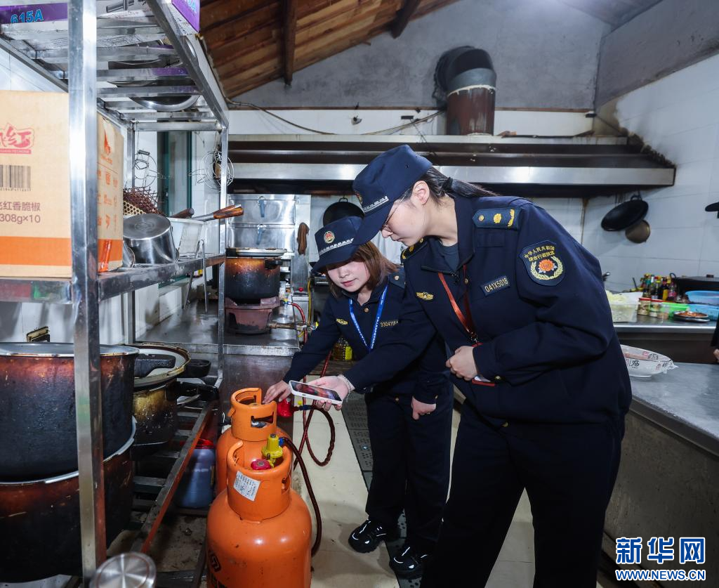 浙江省湖州市吴兴区道场乡综合执法人员在农家乐后厨检查燃气安全。新华社记者 徐昱 摄