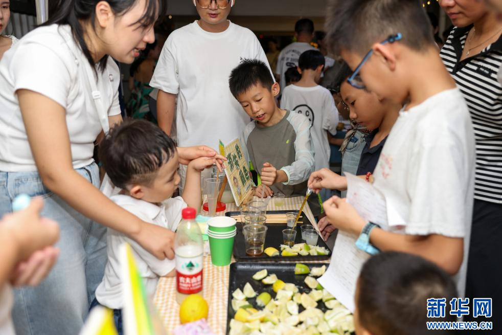 2025年9月13日,小朋友们在“哇,柠檬”展位前体验柠檬汁与碘伏碰撞的实验。新华网发 王斌 摄
