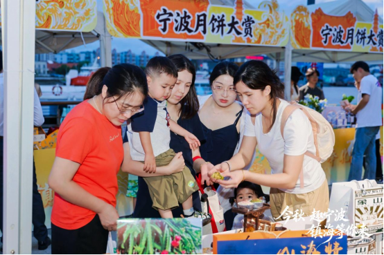 夜晚,镇海渡街区化身“主舞台”。文旅秋日市集早早亮起灯火,空气中飘散着刚出炉的月饼香。三关六码头等宁波本土百余种月饼集中亮相,不少家长带着孩子围在DIY体验区,动手制作专属月饼。“我与宁波的金秋击个掌”互动装置前更是排起长队,每摇一次铃铛,灯塔小窗后就会递出一份秋叶主题的小礼物,惊喜不断。