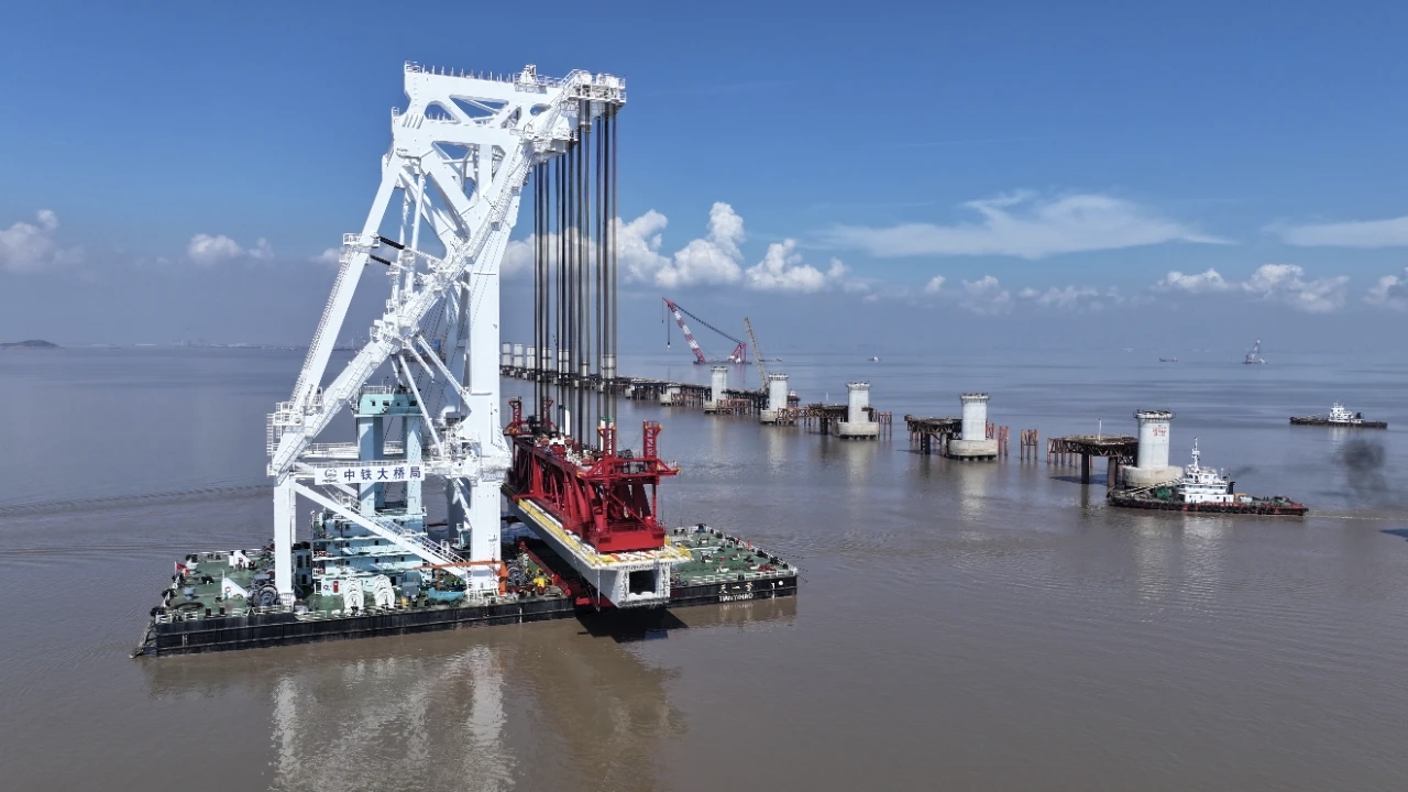 据了解,杭州湾跨海铁路桥是通苏嘉甬高铁的关键控制性工程,全长29.2公里,连接嘉兴海盐与宁波慈溪,设计时速350公里,计划在2027年底具备通车条件。