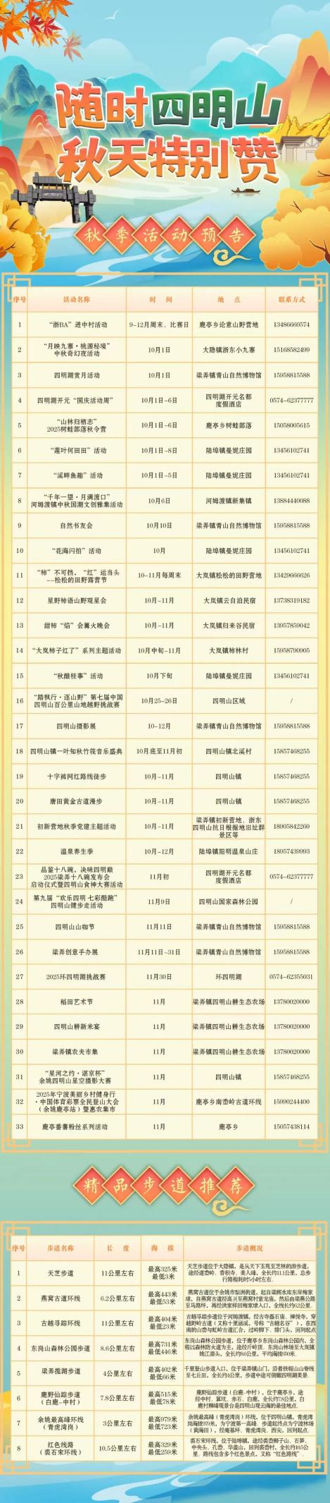 此外,China100越野赛、四明山柿子节、四明湖半程马拉松、四明山食神大赛等季节限定活动也将陆续登场,让旅途动静皆宜、精彩不断。