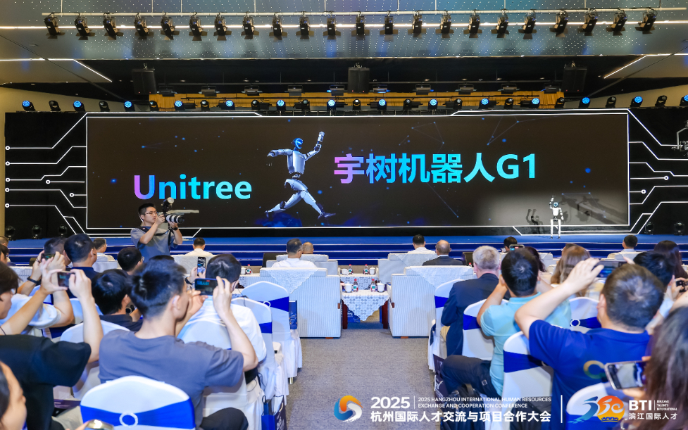 “当红小生”宇树机器人G1以“硅基生命”的独特方式,向与会嘉宾推介具身智能人才发展创新单元。在前一天的2025杭州国际人才交流与项目合作大会上,杭州发布了首批6个“三位一体,两新融合”人才发展创新单元,其中滨江区“具身智能”创新单元是其中之一。