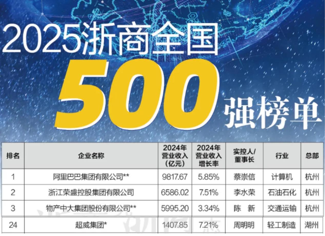近日,《浙商》杂志发布“2025浙商全国500强”榜单,超威集团再次上榜,排名第24位。